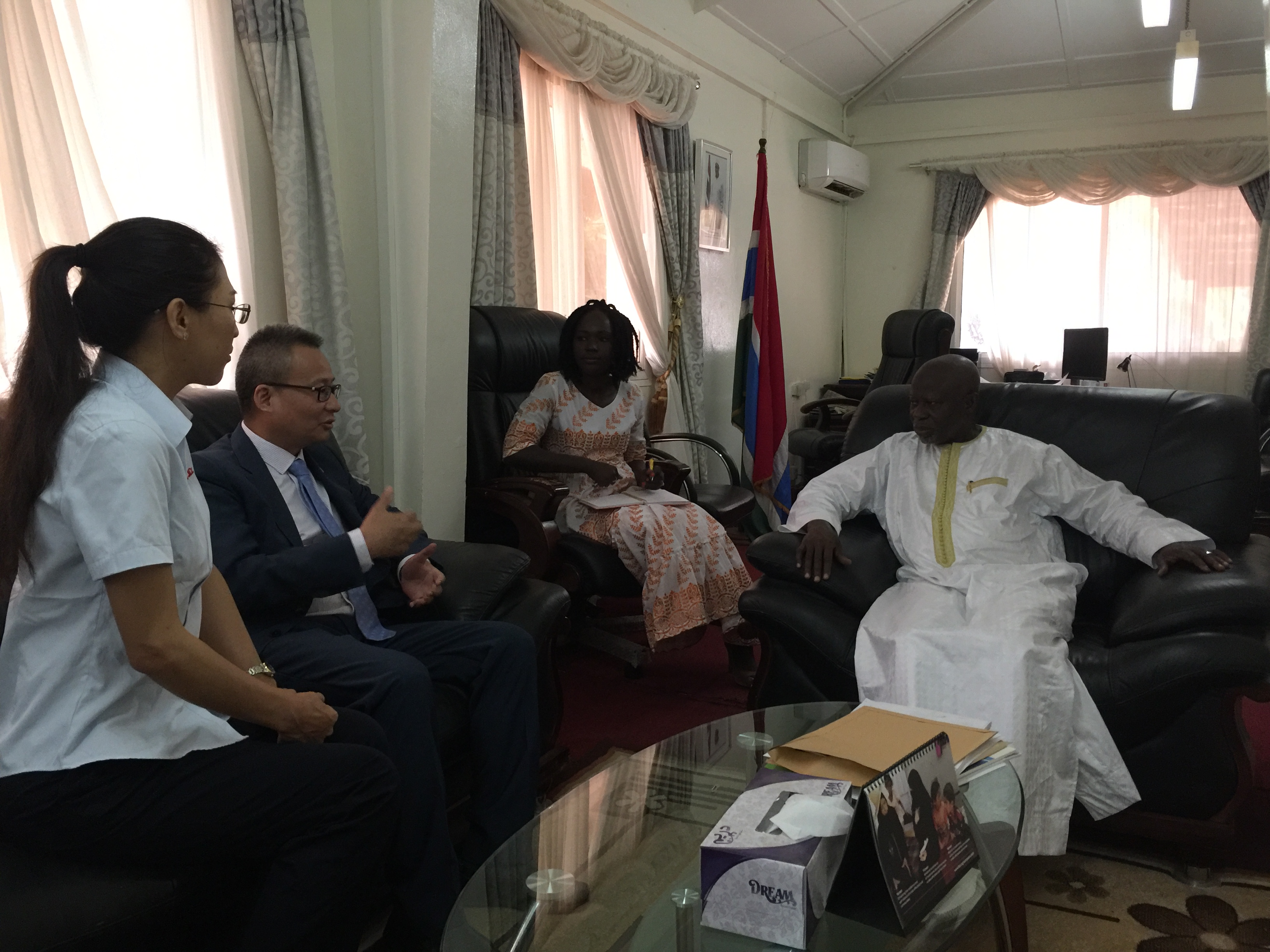 儀式開始前,仇天青總裁還專程前往岡比亞外交部和工程部,分別拜訪了達(dá)博外長和喬貝部長。